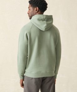 - Detail: Popover hoodie. Double layer hood with drawcord. Raglan sleeves. Kangaraoo patch pocket with hidden zipper pocket. Knit rib at cuffs and hem. Sun & Waves embroidery at wearer’s left cuff. Overlap seams inspired by vintage athletic wear. Woven signature “High Standard Fleece” main label.