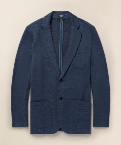 - Detail: Two-button blazer silhouette. Three exterior pockets. Two interior pockets. Unlined blazer construction. Jersey fabric at undercollar and internal bindings. Loop label at interior back neck.