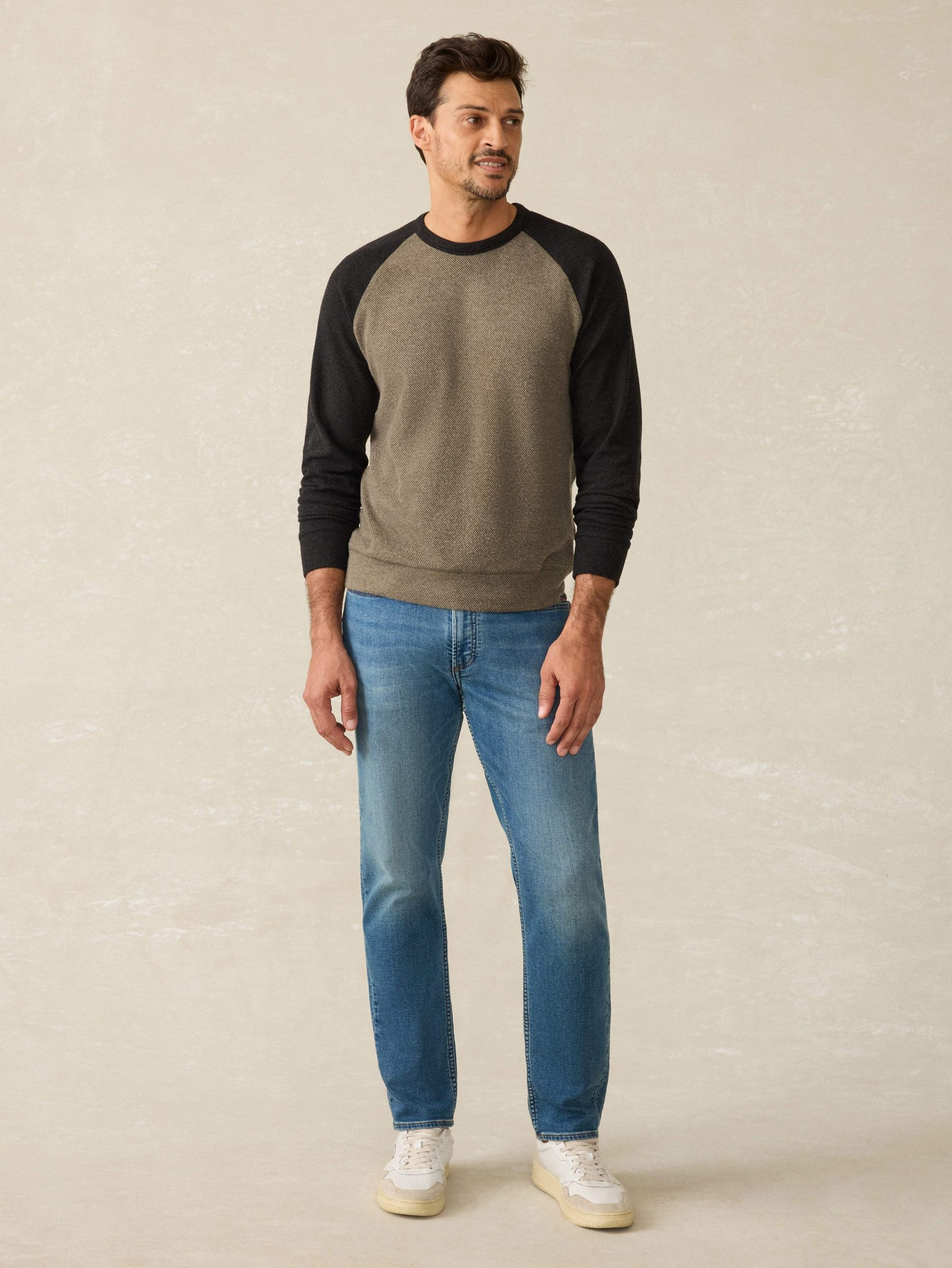 - Detail: Crewneck, pullover style. Contrast raglan sleeves. Banded cuffs and hem. Woven Sun & Waves label at wearer’s left hem.