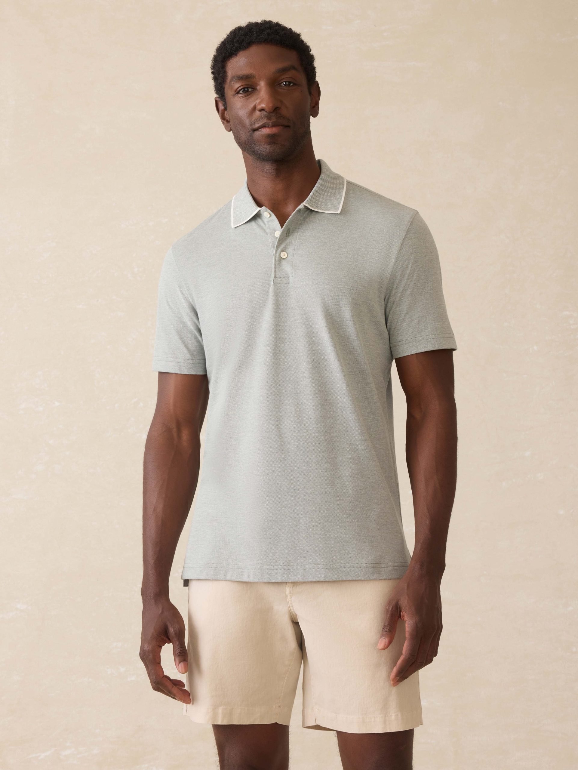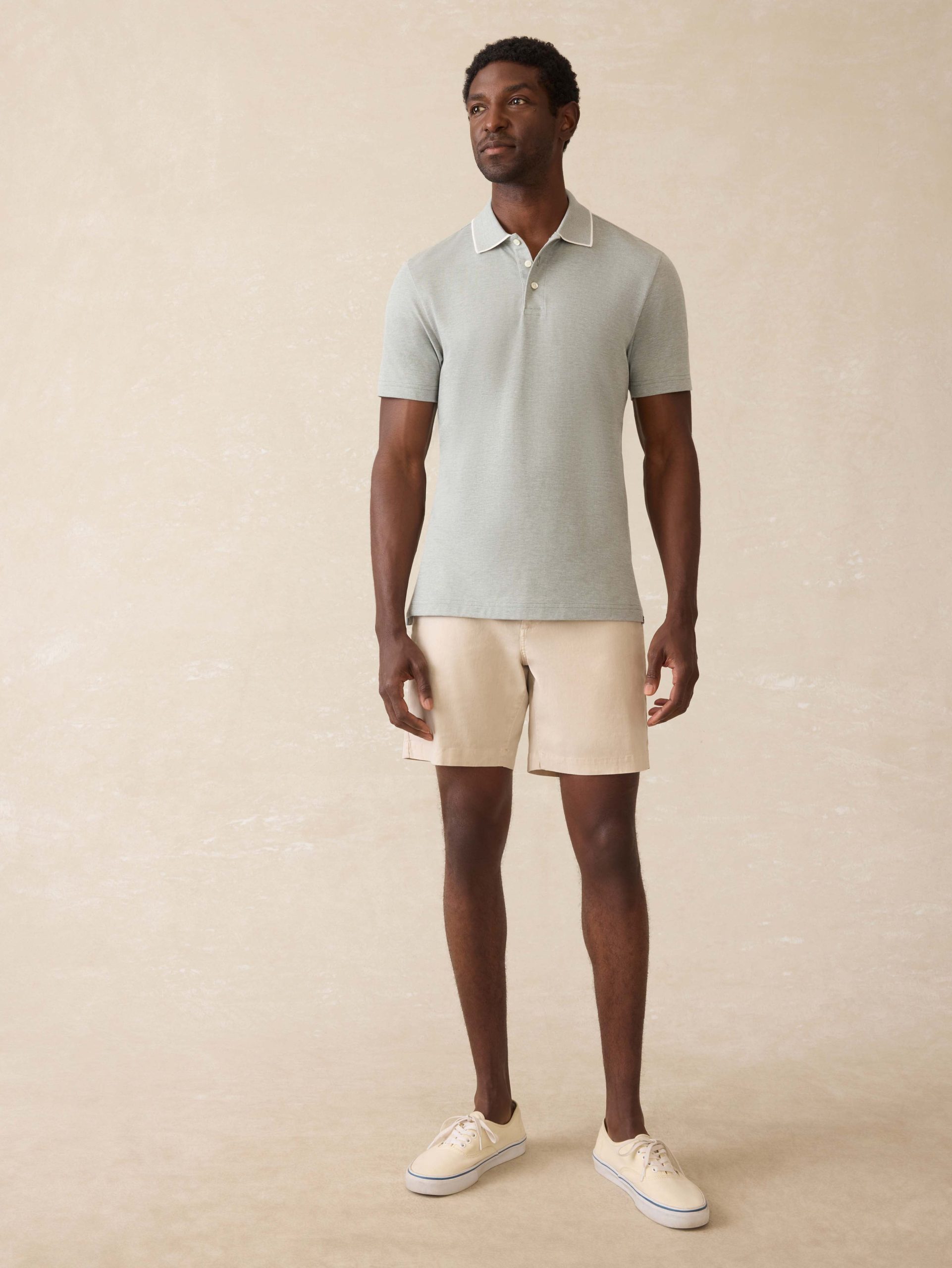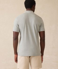 - Detail: Spread collar with built-in collar stays. Three-button placket. Short sleeves. Vented hem. Locker loop and half-moon at interior back neck. Sun & Waves label at wearer’s left hem.Flat knit collar with contrast tipping along edge. Three-button placket. Short sleeves. Vented hem. Locker loop and half-moon at interior back neck. Sun & Waves label at wearer’s left hem.