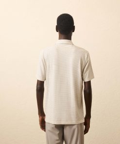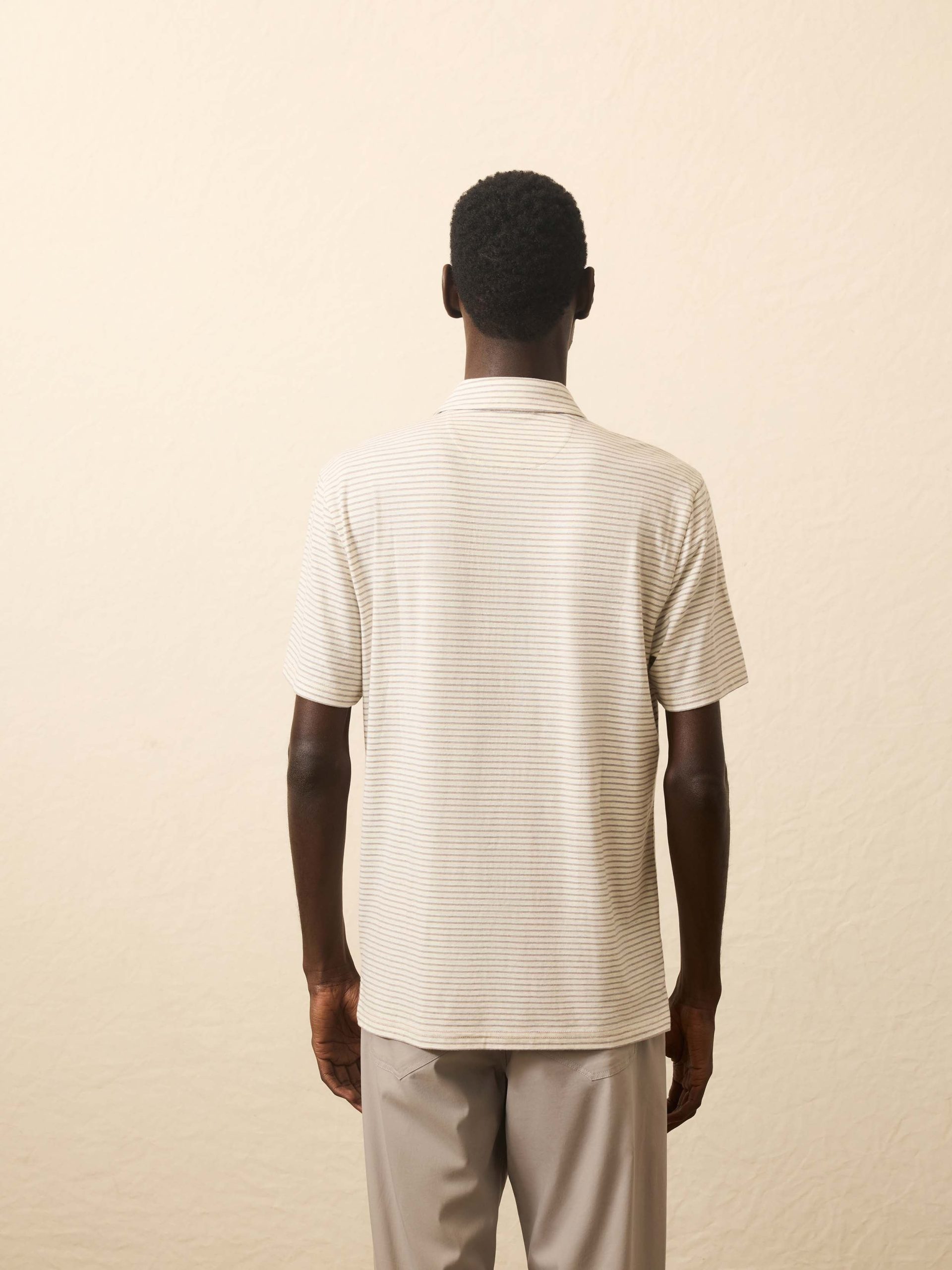 - Detail: Spread collar with built-in collar stays. Three-button placket. Short sleeves. Vented hem. Locker loop and half-moon at interior back neck. Sun & Waves label at wearer’s left hem.Flat knit collar with contrast tipping along edge. Three-button placket. Short sleeves. Vented hem. Locker loop and half-moon at interior back neck. Sun & Waves label at wearer’s left hem.