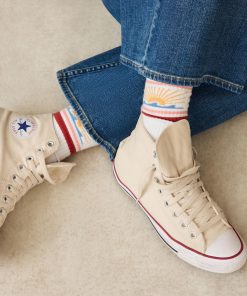 Knit in the USA, these comfy socks featuring our sun and wave motif were meant to peek out and be seen. Wear them slouchy for a casual-cool look or pulled up for a retro fit.