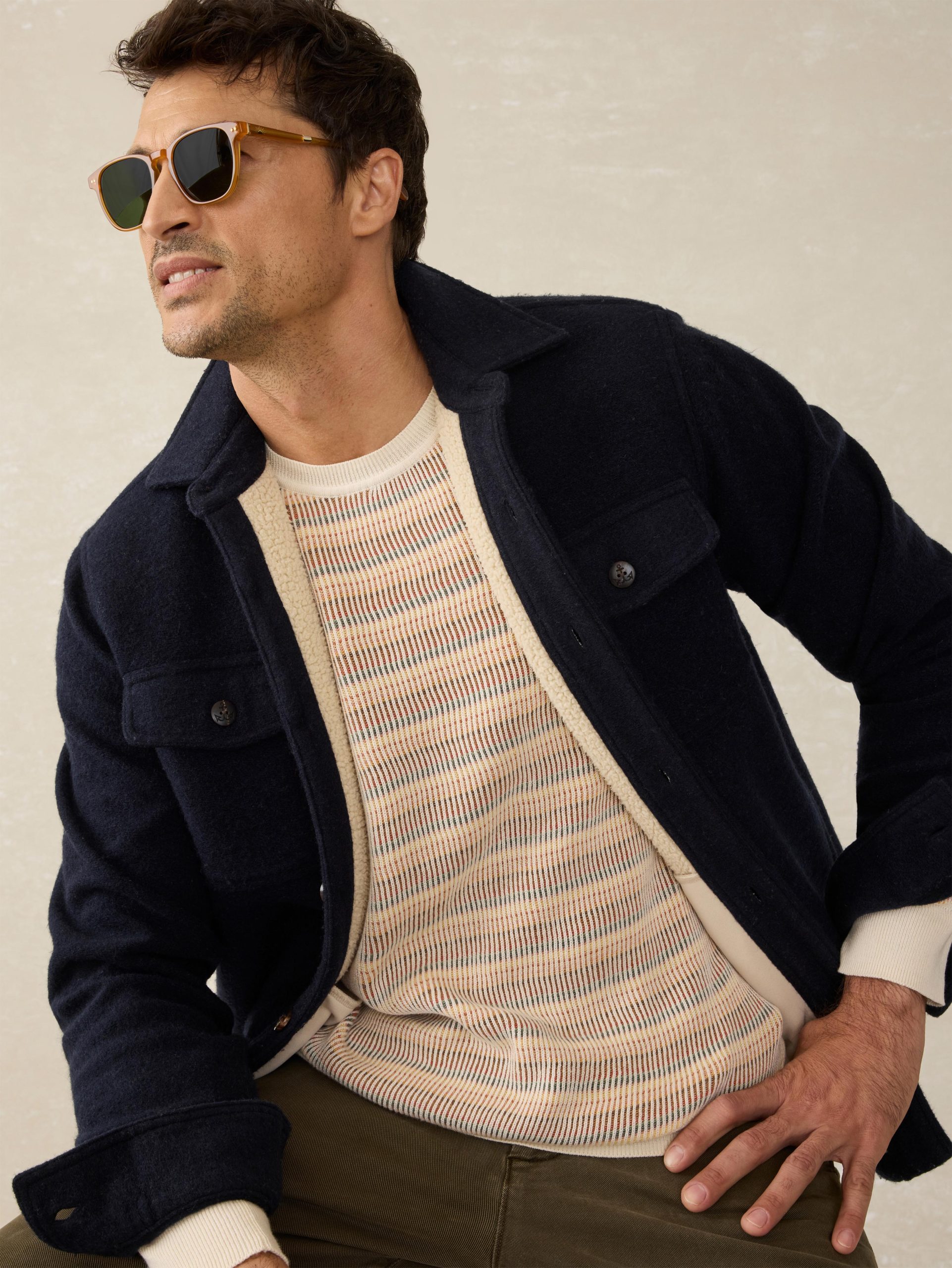 - Detail: Rib stitch at collar, cuffs and hem. Fashioning details at neck and armholes.