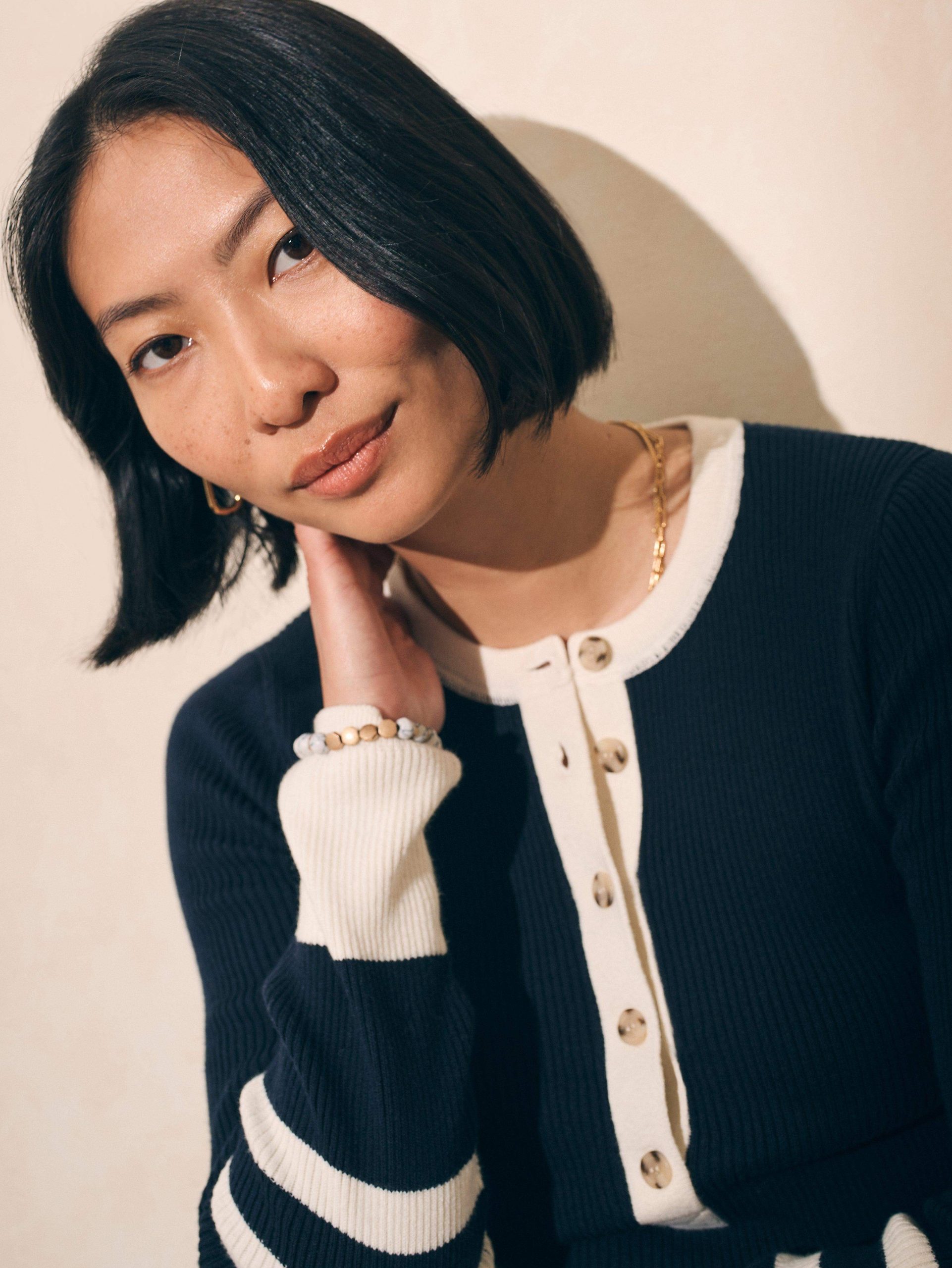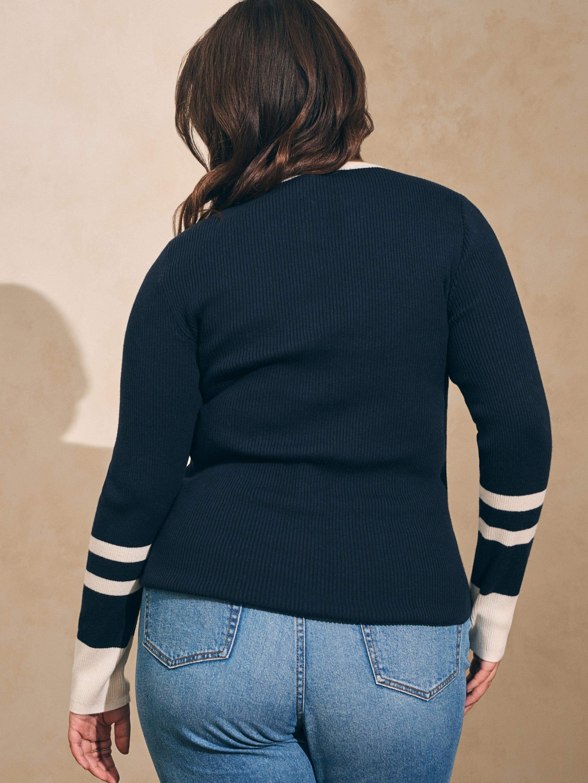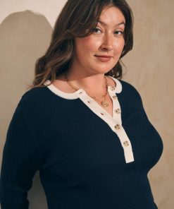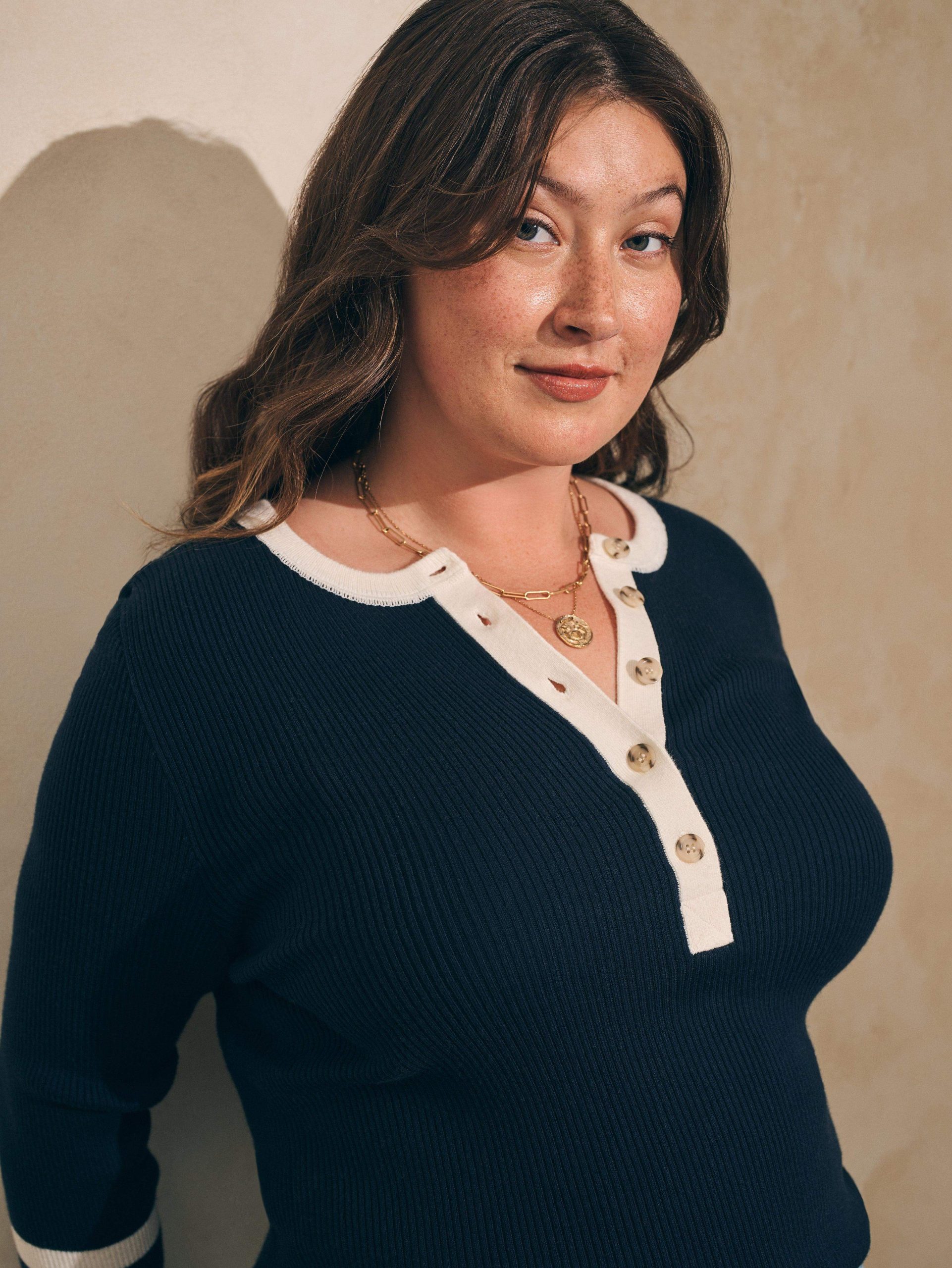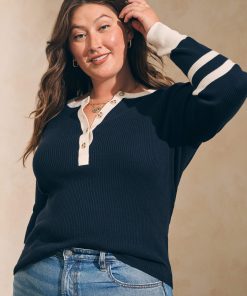 - Detail: Roundneck, five-button placket. Long sleeves with contrast cuffs.