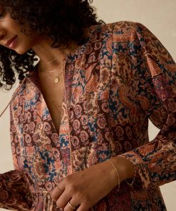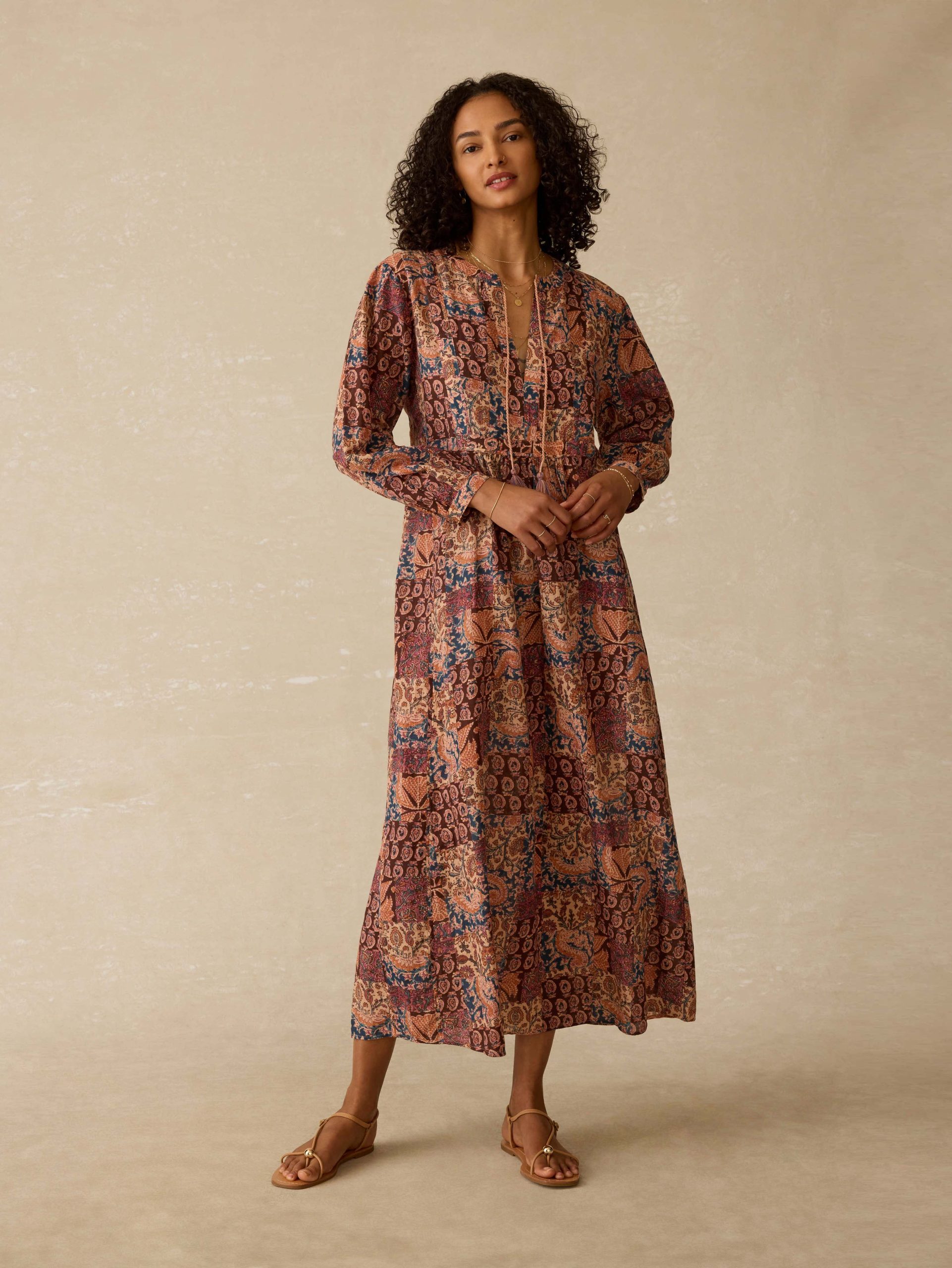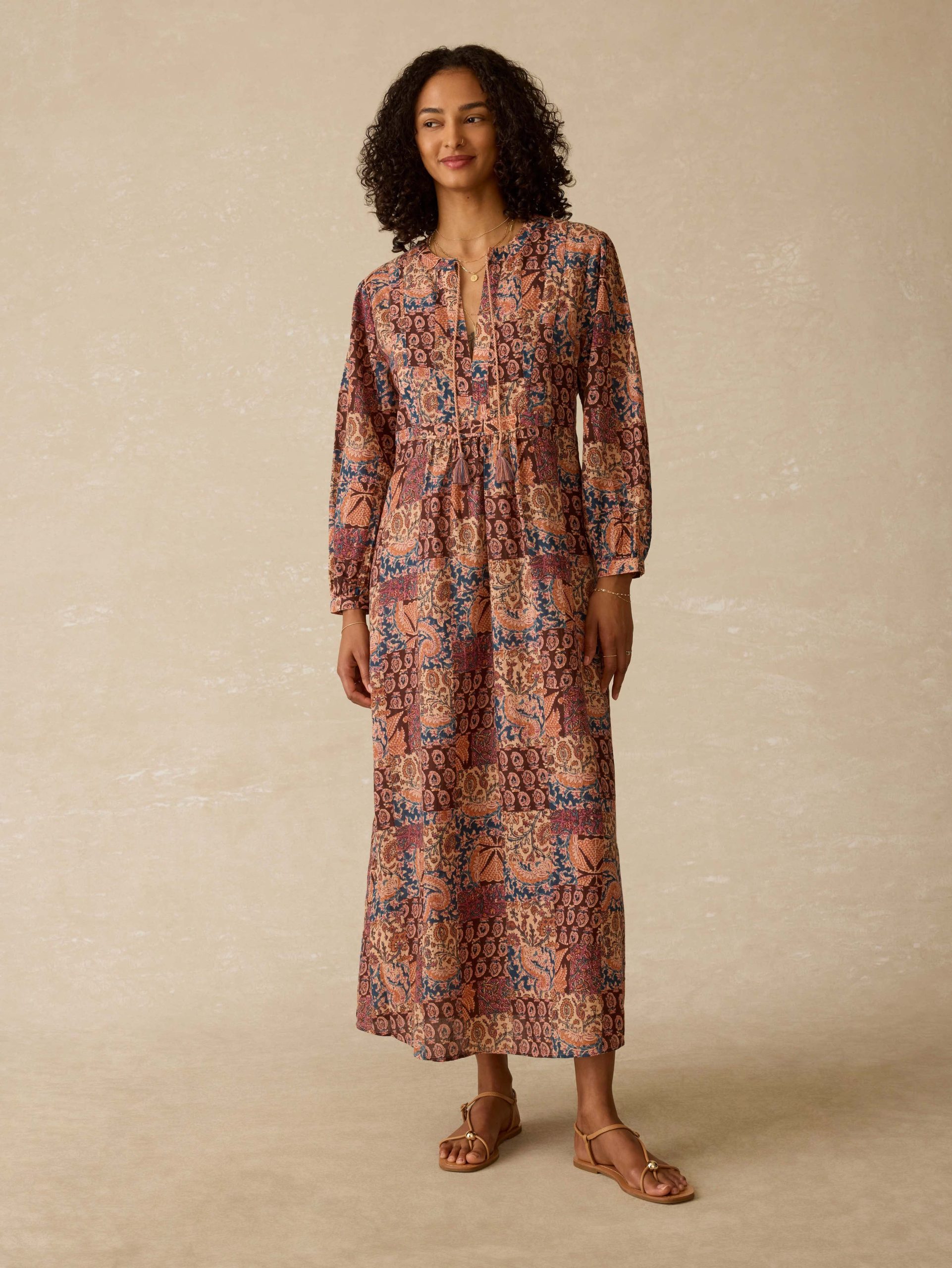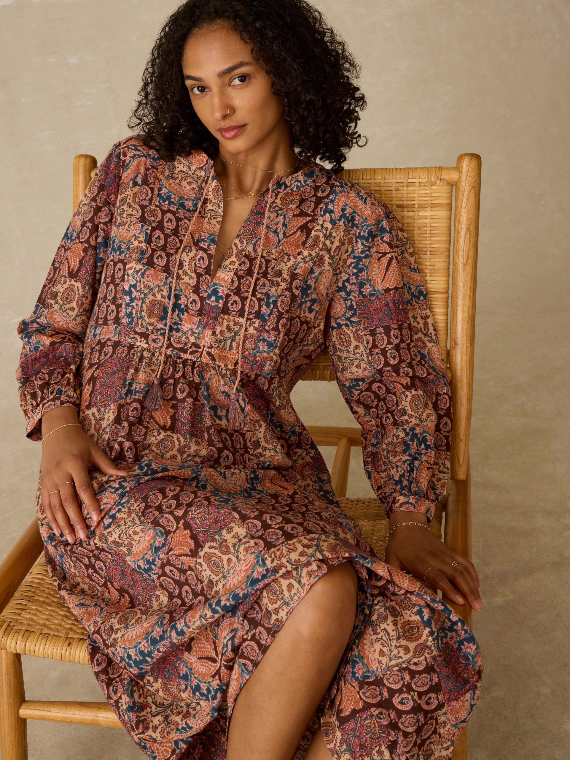Lightweight, breathable, and effortlessly charming—this cotton cover-up is your go-to from sunup to sundown. Featuring a vintage-inspired patchwork print and whimsical tassel ties at the waist, it’s finished with shell buttons at the cuffs for an easy, polished touch. Just toss it on and go.