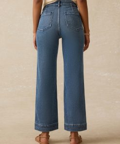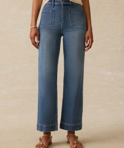 - Detail: Ankle-length indigo stretch terry. Slim wide-leg pants with patched front and back pockets. Regular stretch.