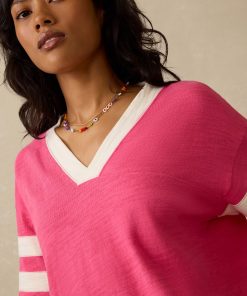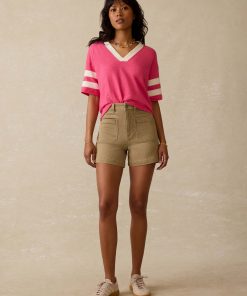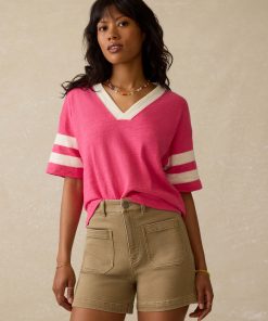 - Detail: V-Neck tee with contrast piecing details at neckline and sleeves. Clip label at bottom hem.